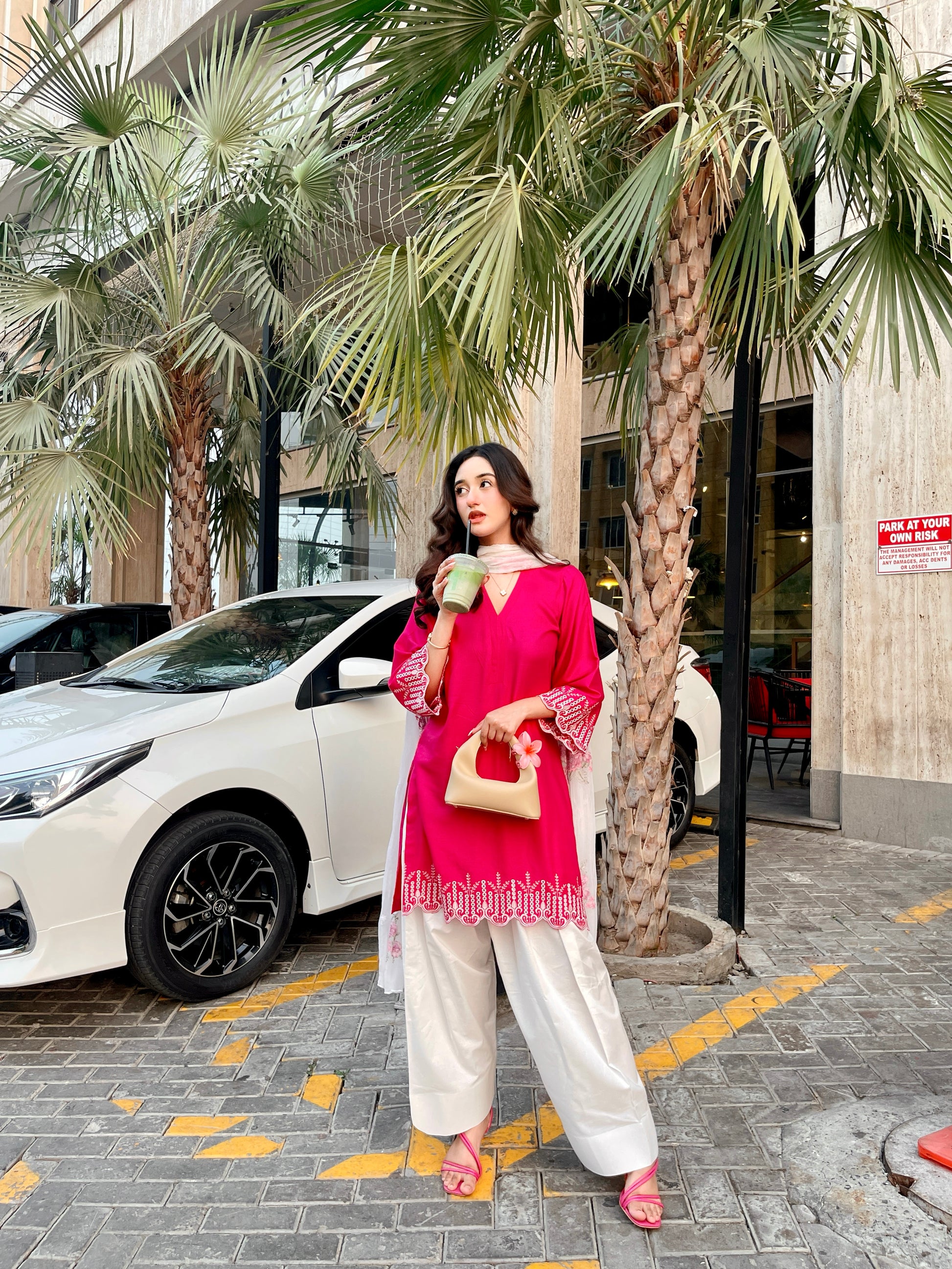 2 piece shalwar and short kameez with schiffli embroidered sleeves and borders